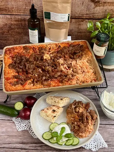 Ein schnelles, aromatischesOfen-Gericht zum Feierabend: Gewürztes Gyros-Geflügel oder -Wiege aus Schwein oder Hähnchen, knusprig gebacken auf einem Blech mit gevierteltem Gemüse wie Paprika, Zwiebeln und Kartoffeln. Dazu gibt es eine cremige Sauce oder Tzatziki, frische Kräuter und damit eine harmonische Kombination aus herzhaftem Fleisch, knackigem Gemüse und würziger Note. Ideal zum Teilen, unkompliziert in der Zubereitung und perfekt für gemütliche Abende.