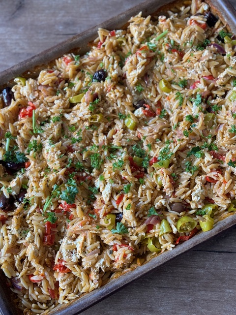 Kritharaki-Blech aus dem Ofen: Ein schnelles, mediterranes Rezept mit Gemüse und Nudeln – perfekt für ein einfaches Familienessen.