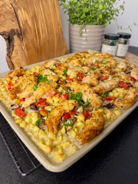Spätzleblech mit Hähnchen Ein herzhafter One-Pot-/Backblech-Klassiker: zarte Hähnchenstücke, knackige Paprika und Zwiebeln, dazu cremige Spätzle, alles in einer aromatischen Sauce aus Sahne oder Brühe. Das Ganze wird auf einem Backblech verteilt und im Ofen gebacken, bis die Spätzle weich, das Hähnchen saftig und der Käse (optional) goldbraun gratiniert ist. Mit frischer Petersilie garniert – perfekt als unkompliziertes Familiengericht.